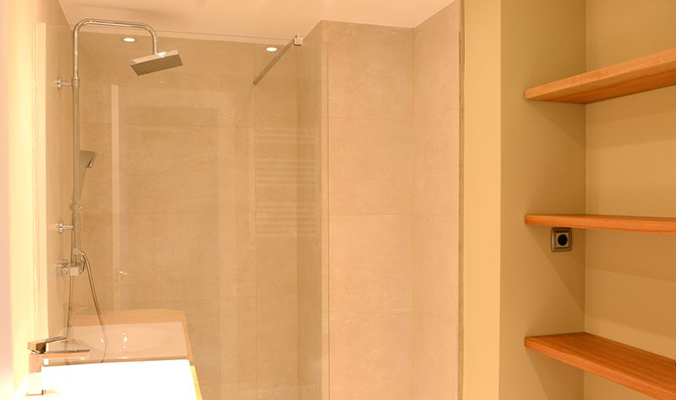 En los baños se colocó alicatado tan sólo en las zonas de agua, quedando el resto enlucido y pintado, esto hace que el espacio de los cuartos húmedos nos resulte más casero y familiar. En el baño del dormitorio principal se realizó un mueble a medida que se modificó hasta adaptarlo al espacio requerido por los usuarios.