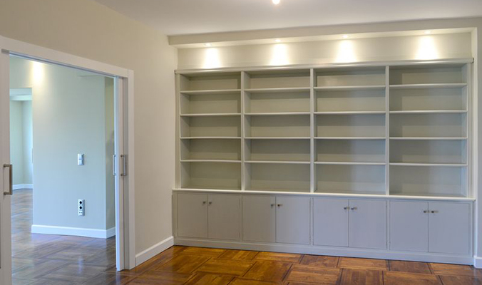 Para conseguir luminosidad, todos los armarios, puertas de paso y rodapié se fabricaronlacados en blanco, al igual que la cocina, realizada totalmente a medida. La puerta de acceso a la zona de servicio desde el salón se realizó en vidrio templado transparente, creando así un espacio visual continuo.